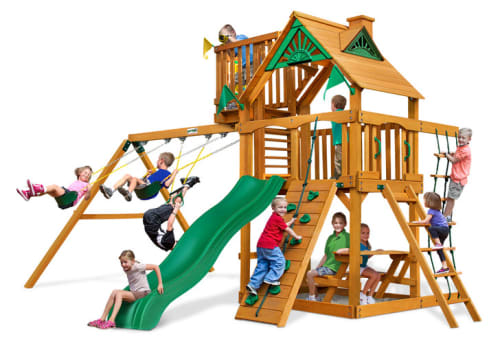 When you bring home the Gorilla Playsets Chateau w/ Sky Loft Swing Set you're adding a whole new level to your kids play time (literally)! Our new Sky Loft addition includes it's very own Tic-Tac-Toe panel, Telescope with Compass and a pair or flags to top it off. Take every day fun to new heights. Order yours today!